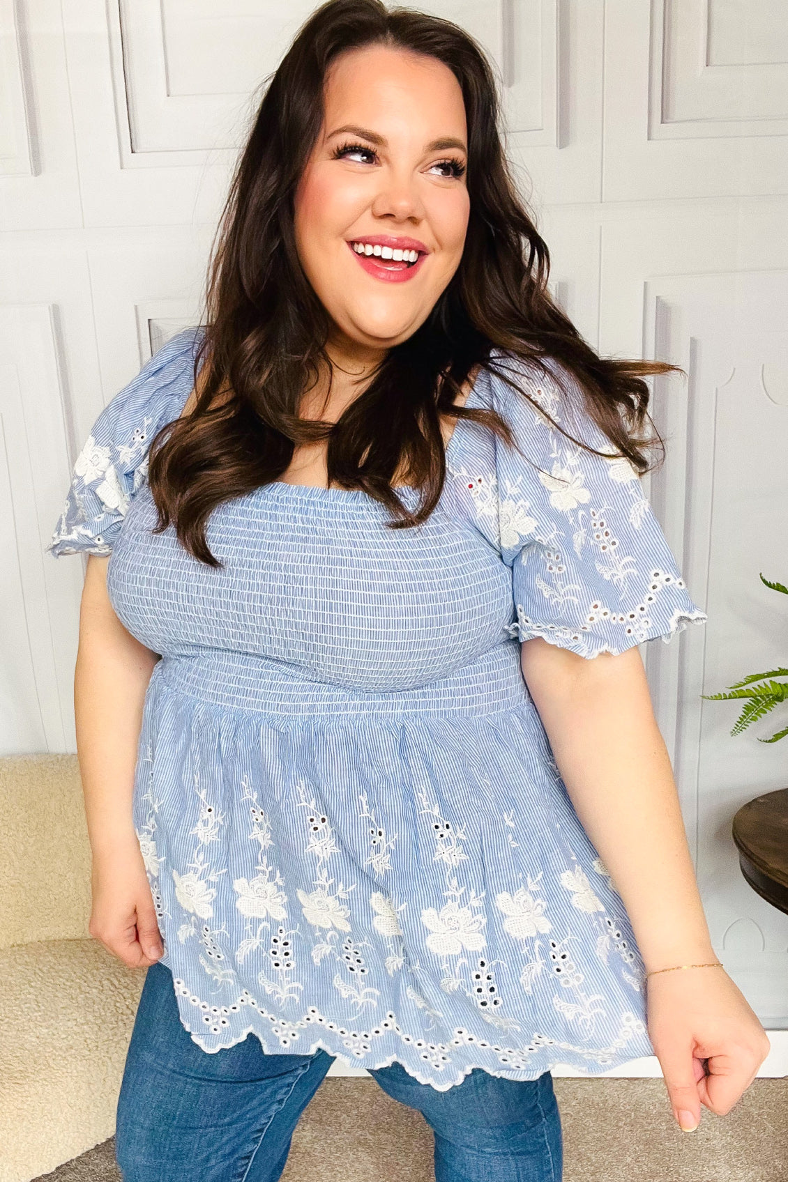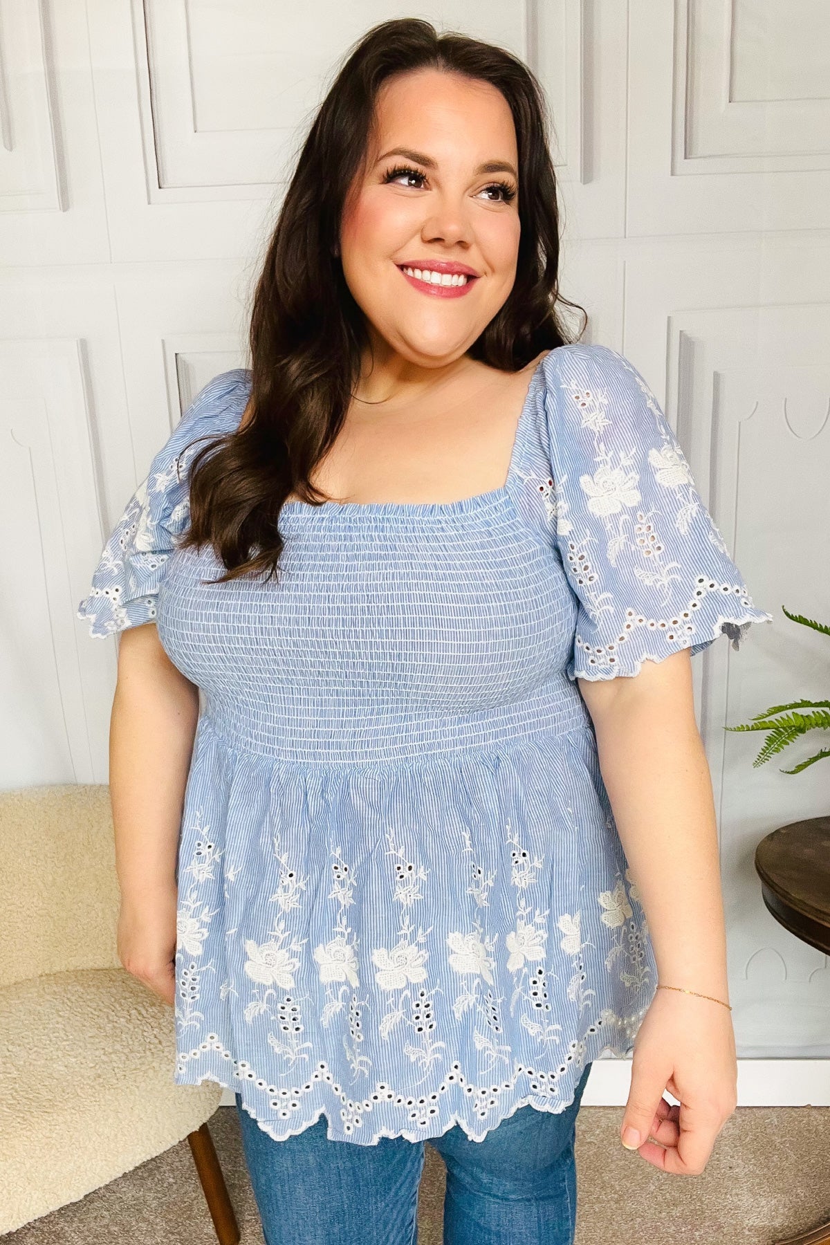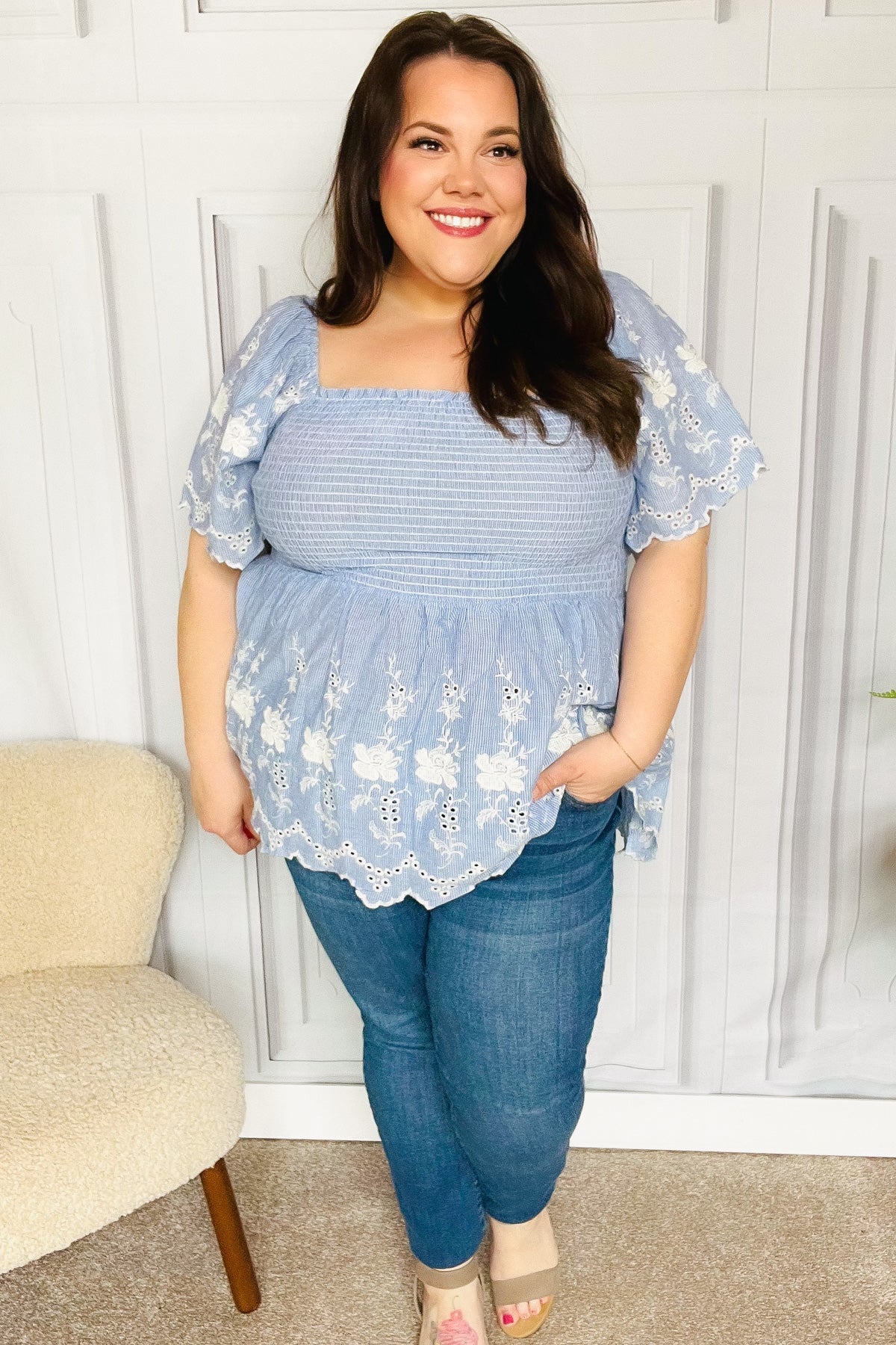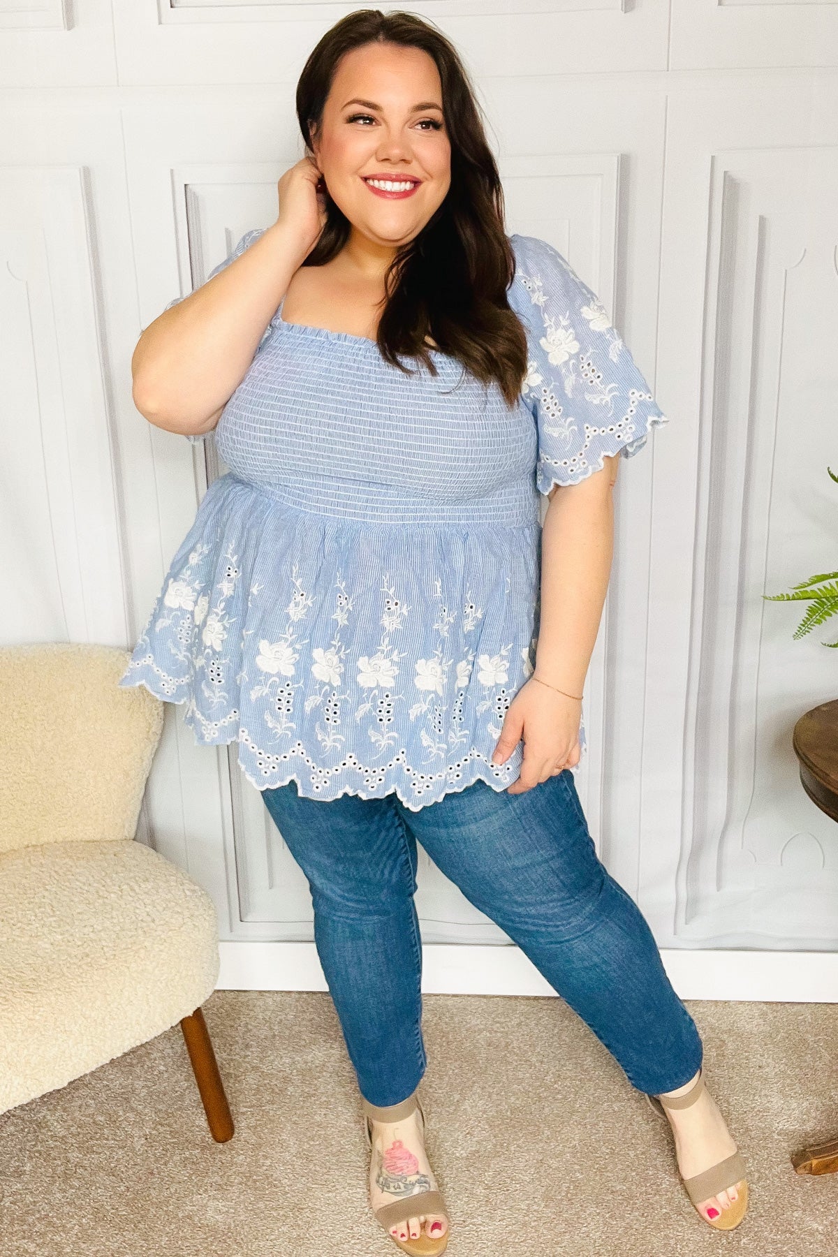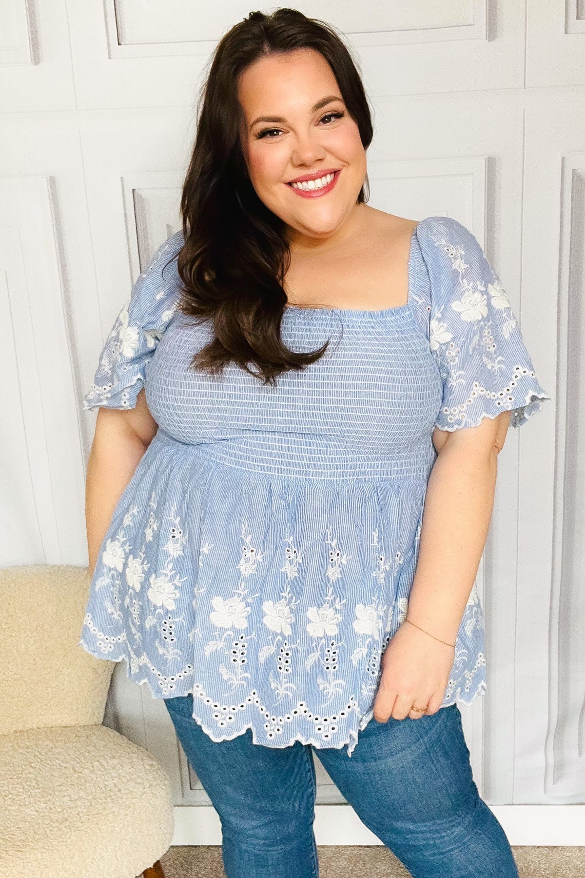 Just A Dream Blue Smocked Floral Embroidered Babydoll Top