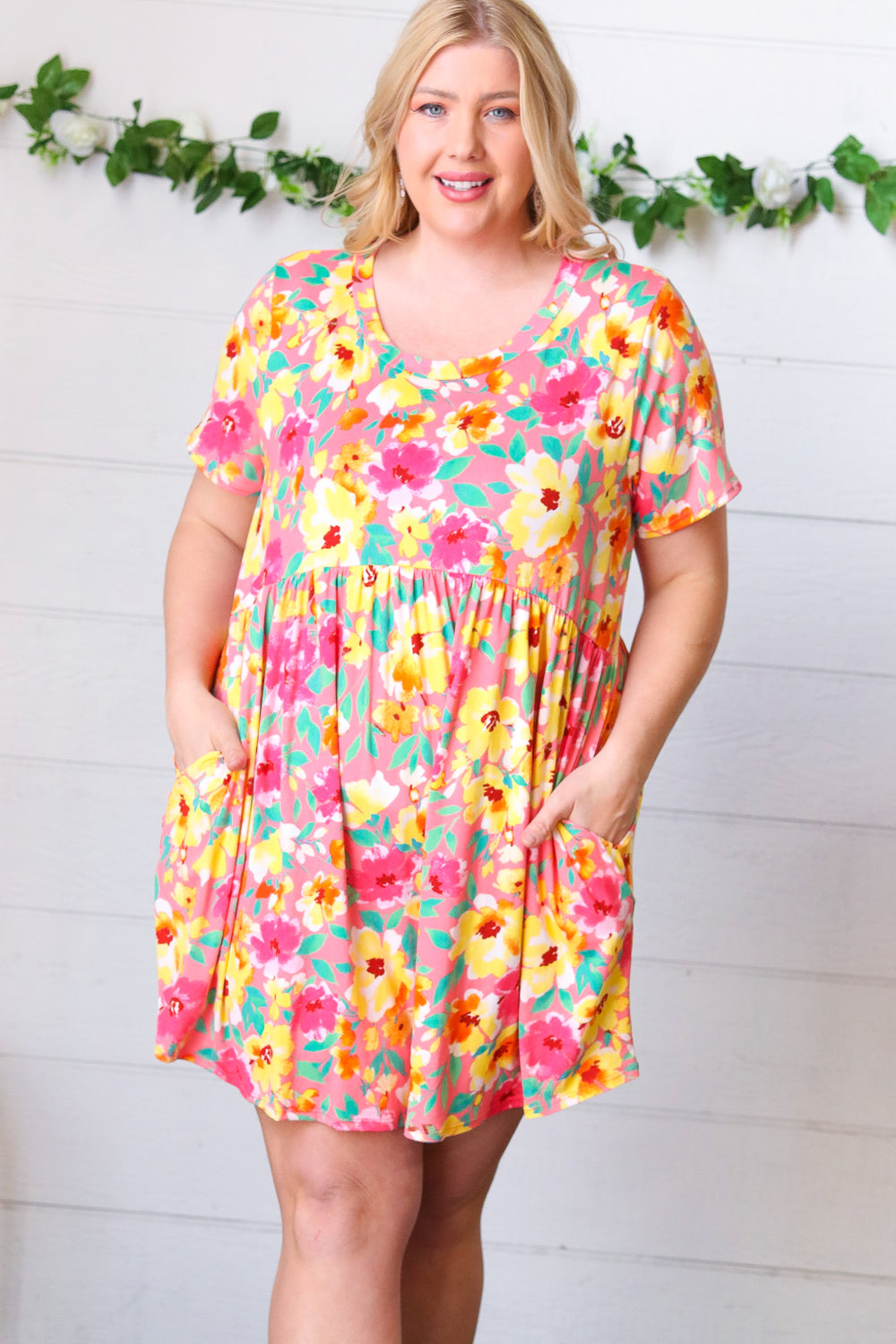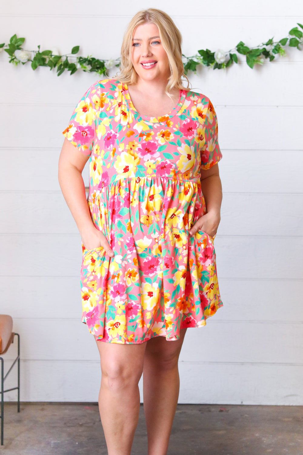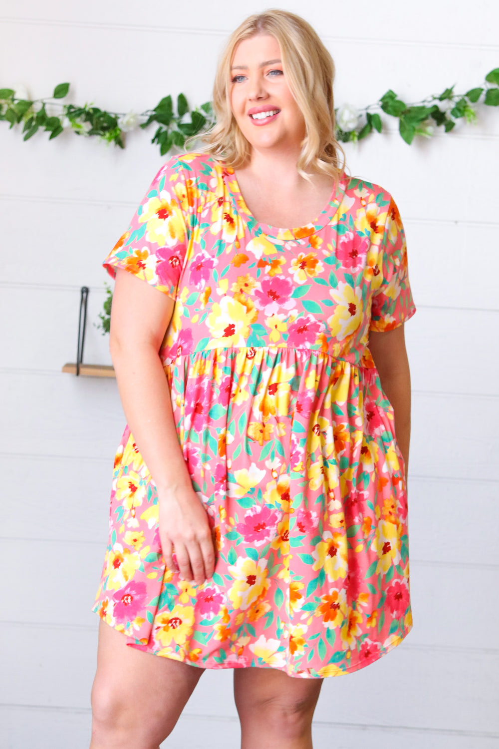 Eye-catching yellow and magenta florals elevate this classic fit and flare babydoll dress! Buttery soft feel and cozy side pockets complete this stunning look.