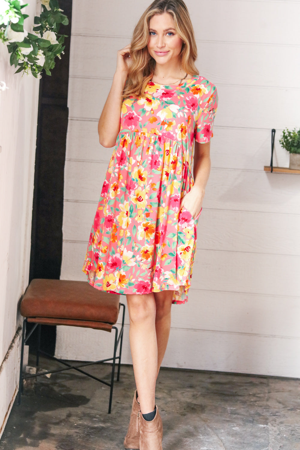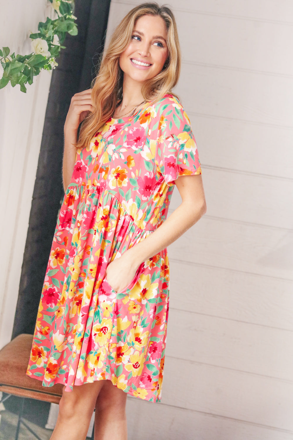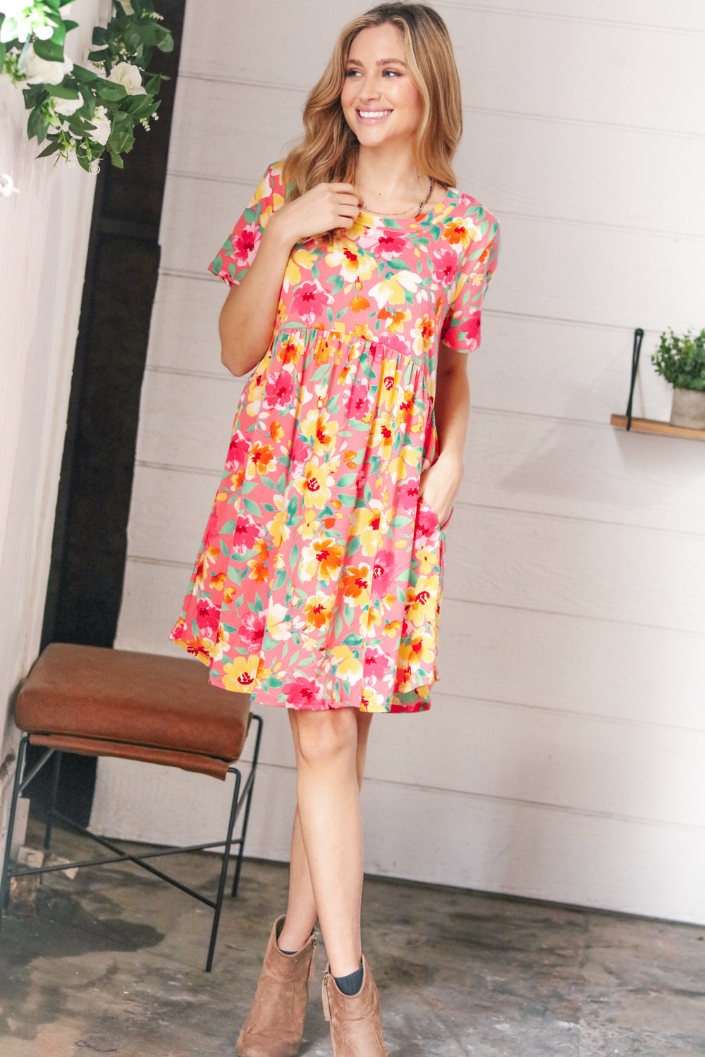 Eye-catching yellow and magenta florals elevate this classic fit and flare babydoll dress! Buttery soft feel and cozy side pockets complete this stunning look.