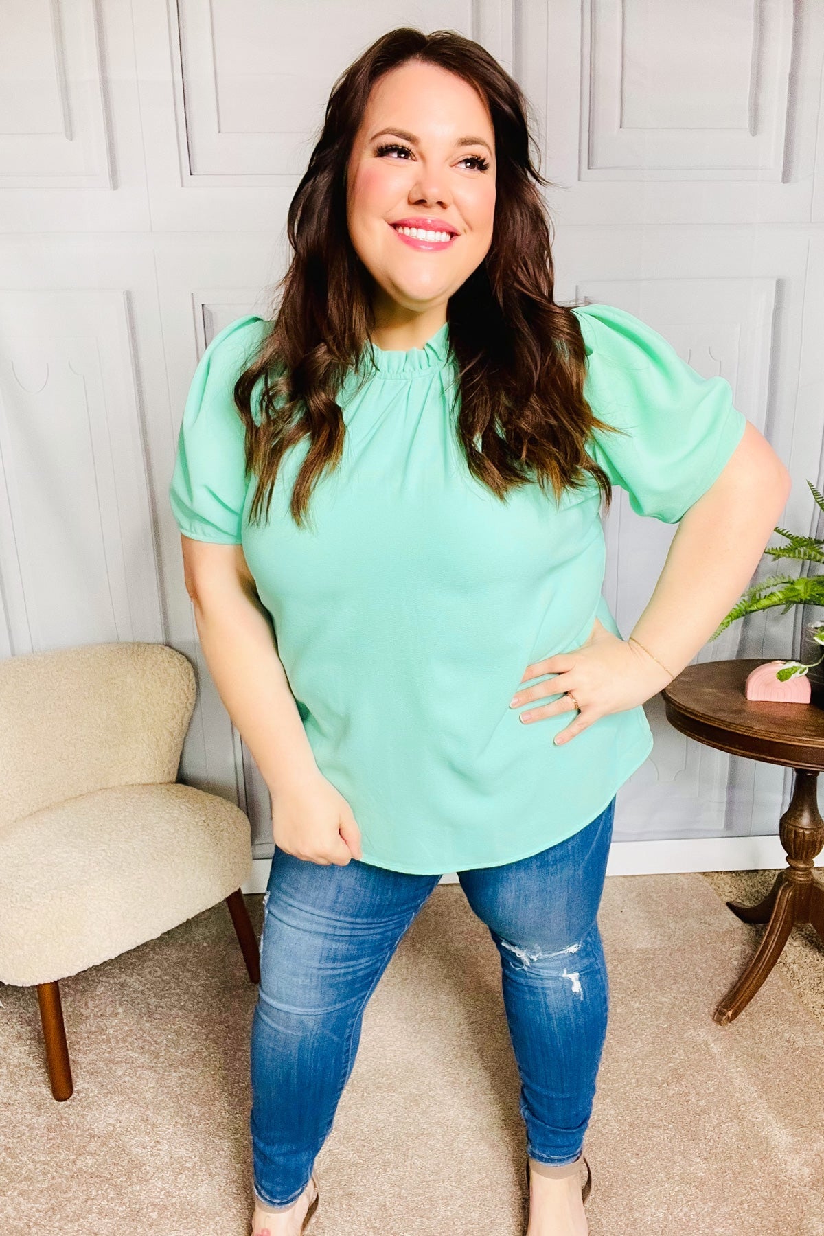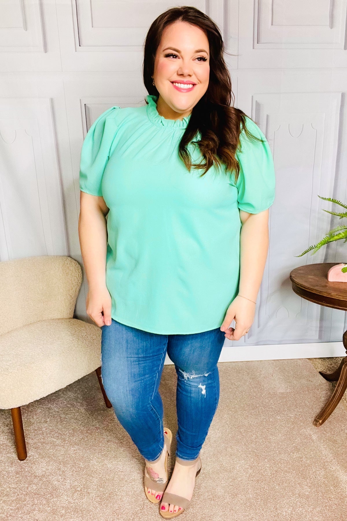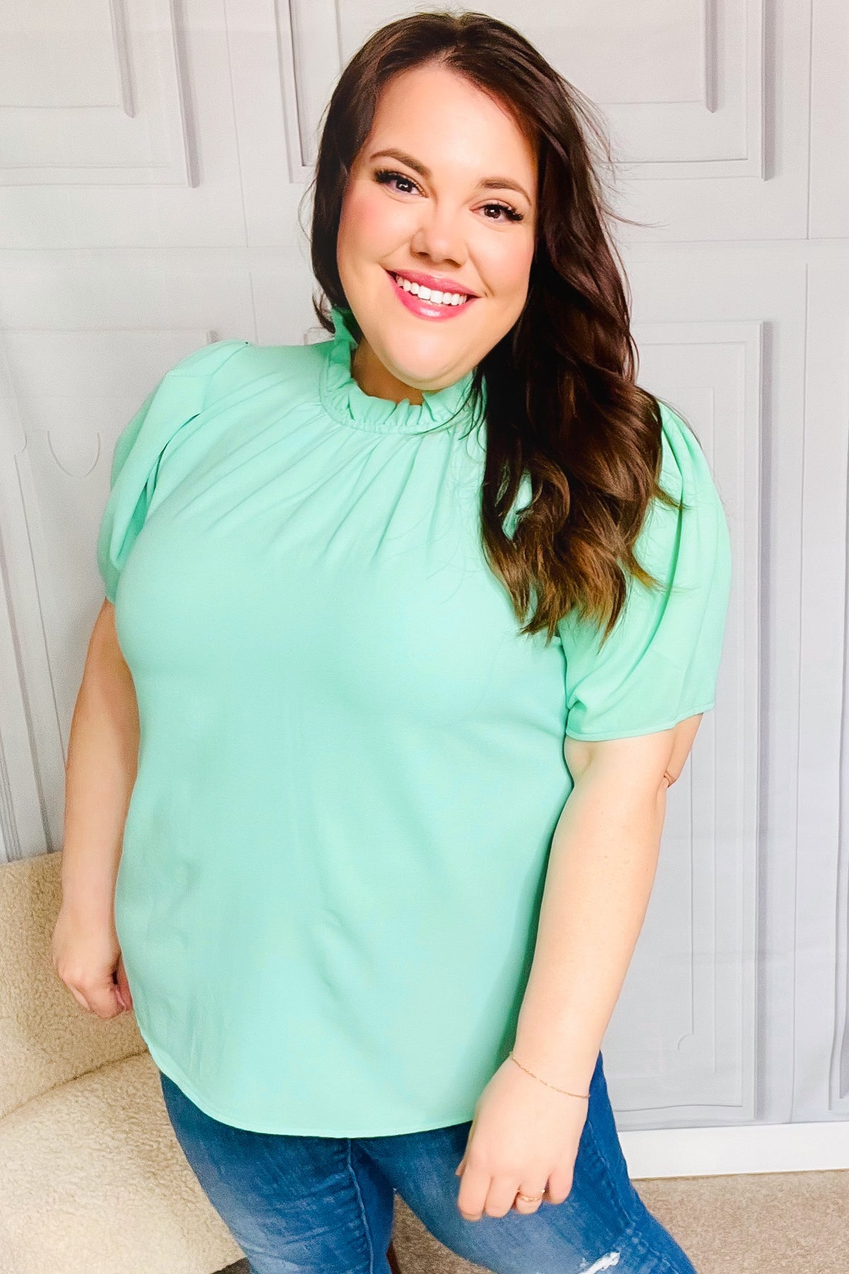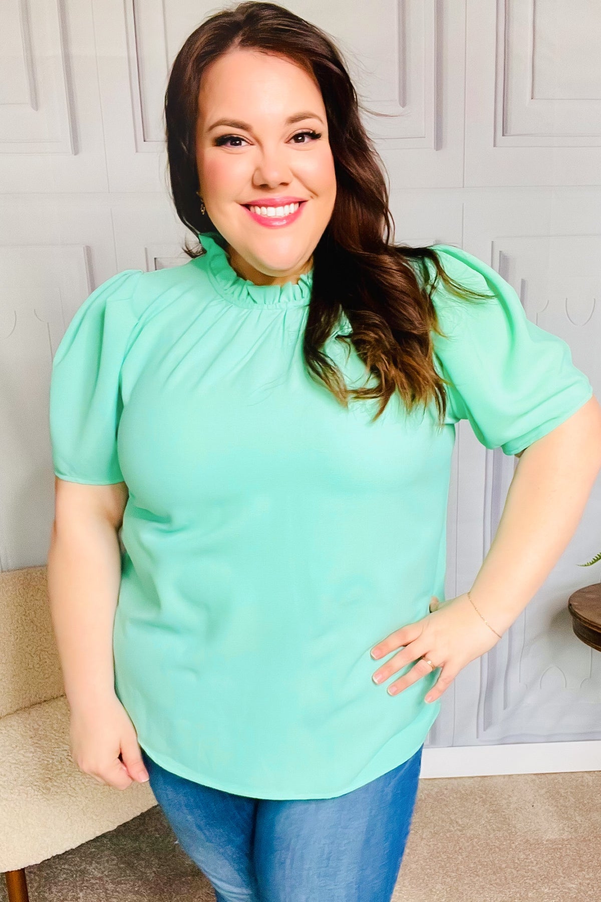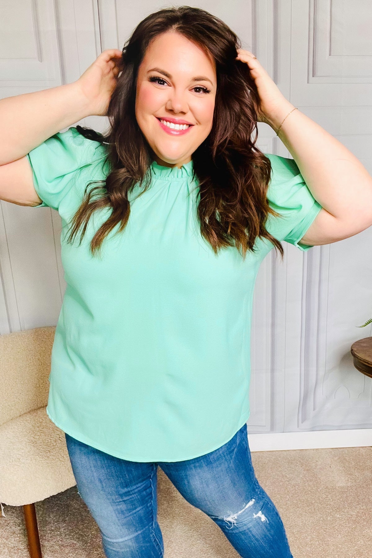 Capped puff sleeves, frill mock neck and beautiful button back define this woven top. Turn heads this spring season with this elegant top.