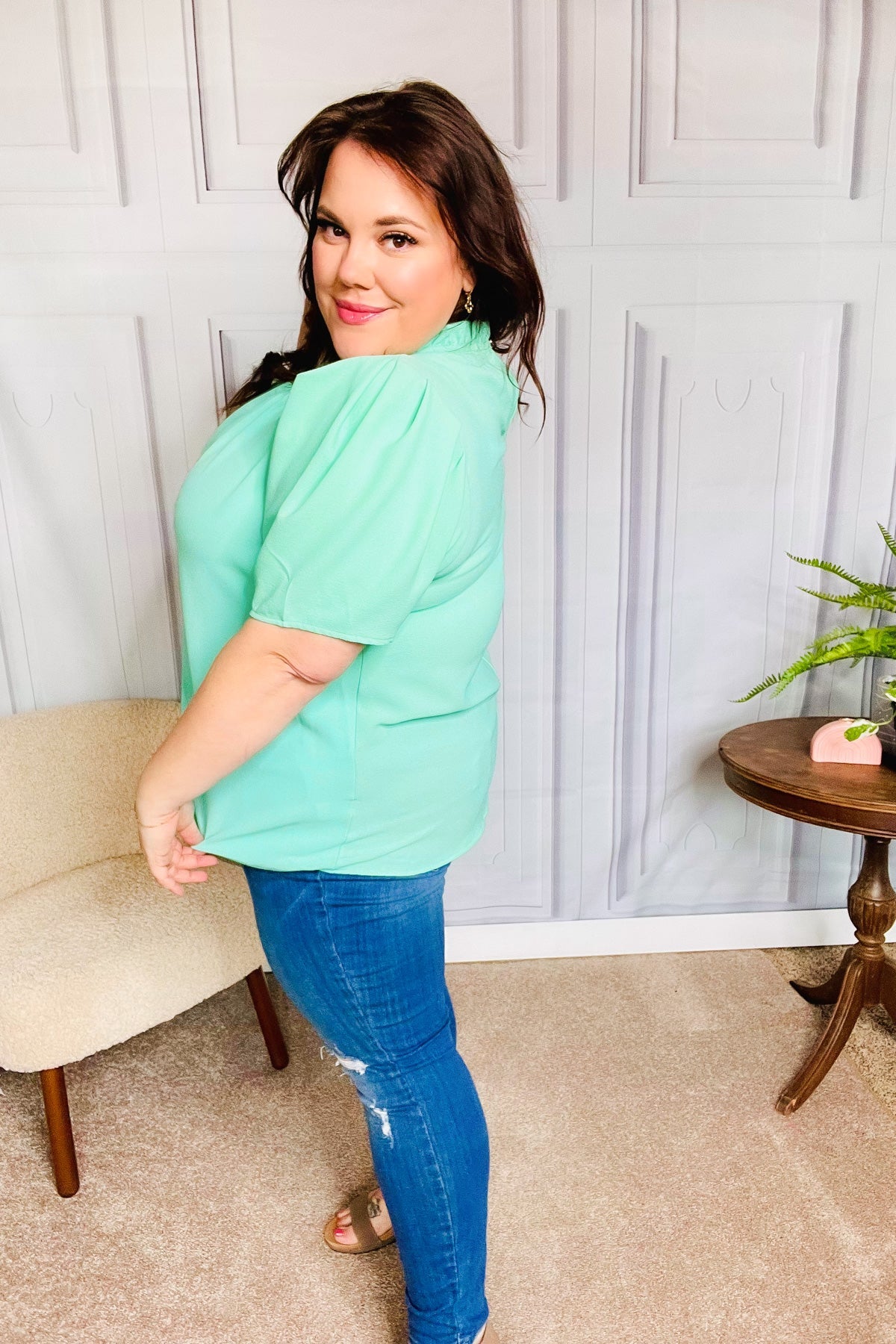 Capped Puff Sleeves + Frill Mock Neck + Button Back